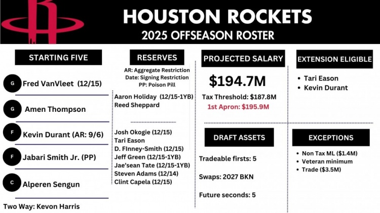 此外,火箭目前有凯文-哈里斯一名双向球员,还有两个双向名额,下赛季双向球员的工资是63.6万,双向合同是不计入工资帽的。
