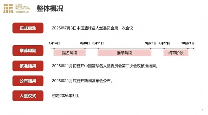 2025年中国篮球名人堂的入堂规模计划为9名个人和1个集体,具体包括:杰出运动员4人(男女各2人)、杰出教练员1人、杰出裁判员1人、中国篮球先行者3人,以及优秀集体1个,其中中国篮球先行者(3人)由名人堂执行办公室组建“中国篮球先行者举荐专业委员会”负责提名,直接进入终审阶段。