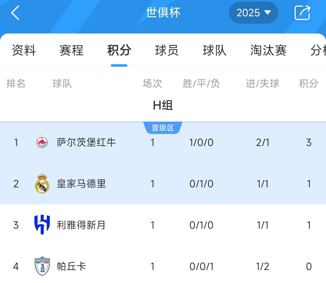 H组首轮比赛中,皇马1-1战平利雅得新月,暂列小组第2;帕丘卡1-2负于萨尔茨堡红牛,排名小组垫底。
