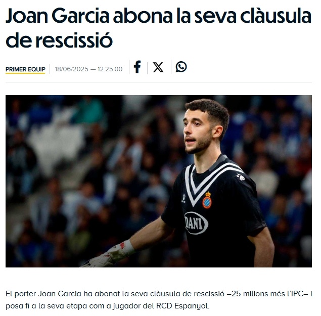 西班牙人公告:门将霍安-加西亚已支付了他的解约金,2500万欧元外加IPC(通货膨胀调整),结束了他作为西班牙人队球员的生涯。