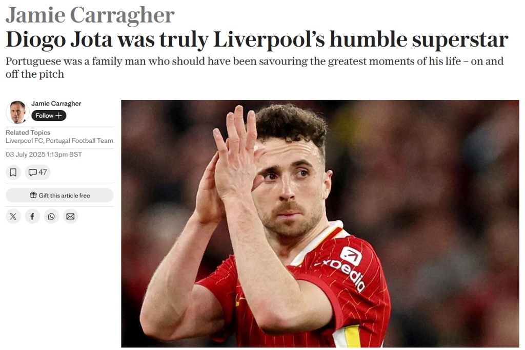 他如此年轻便被夺去生命,令人痛心。他将被数百万利物浦和葡萄牙球迷铭记为英雄,他们都需要时间来接受这个残酷的现实:他再也没有机会创造更多精彩的足球回忆,也无法再次听到他为观众带来多少欢乐的回响。