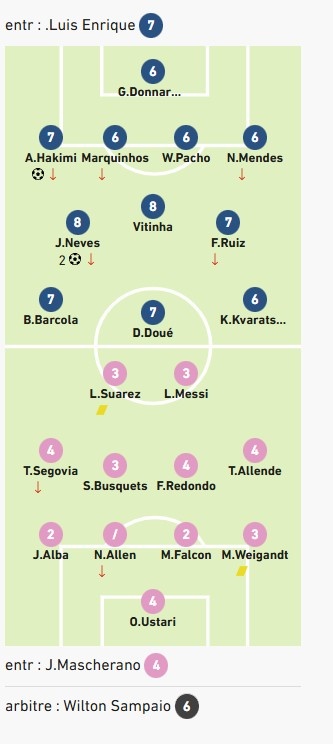 巴黎首发:多纳鲁马6分,阿什拉夫7分,马尔基尼奥斯6分,帕乔6分,门德斯6分,若奥-内维斯8分,维蒂尼亚8分,法比奥-鲁伊斯7分,巴尔科拉7分,杜埃7分,克瓦拉茨赫利亚6分