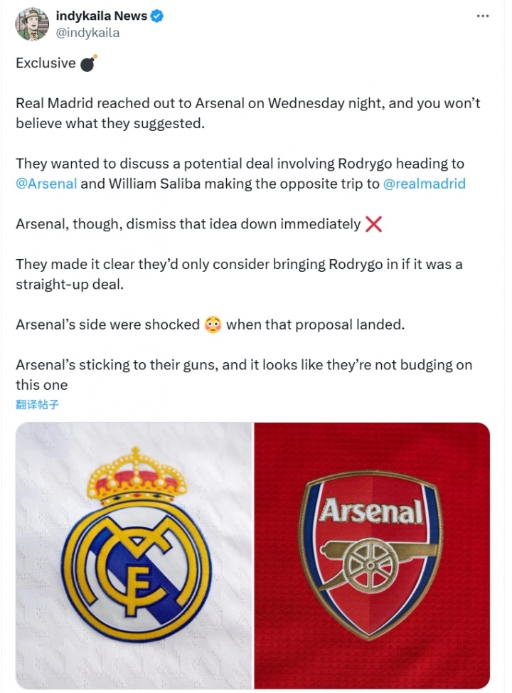 据知名转会博主绿帽哥“Indykalia News”独家消息,皇马周三晚与阿森纳取得了联系,提议用罗德里戈交换萨利巴,这一提议被阿森纳立即拒绝。