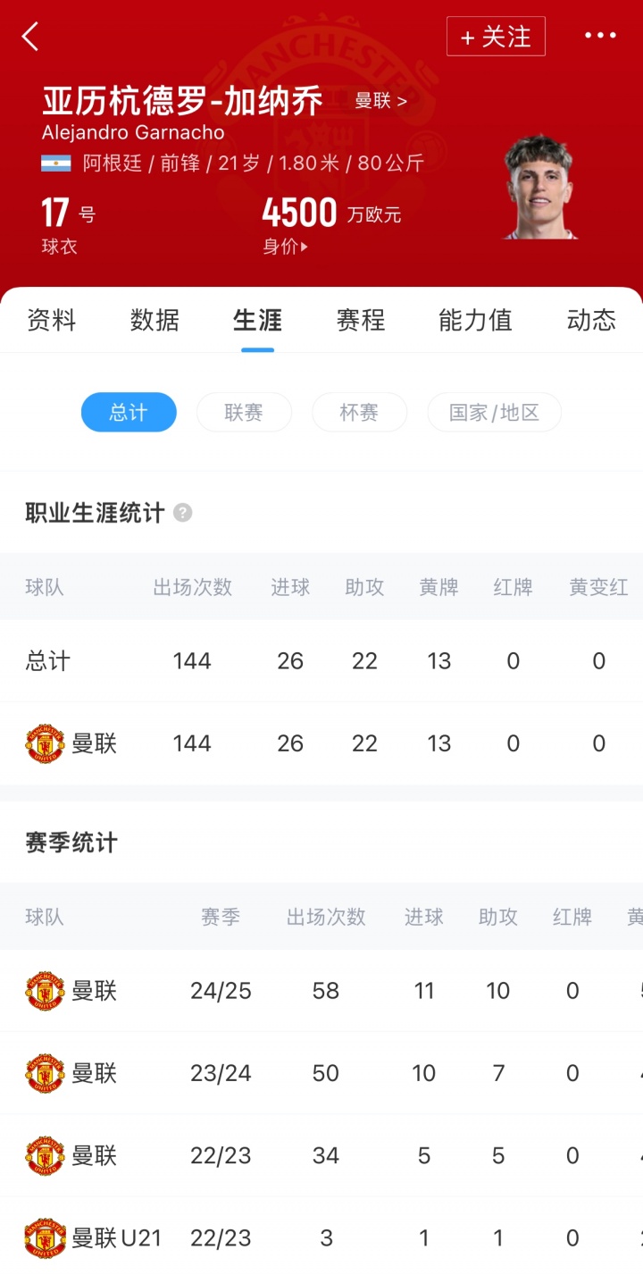 加纳乔现年21岁,阿根廷前锋,与曼联的现有合同将在2028年到期,现德转估值为4500万欧。上赛季,加纳乔为曼联出场58场,取得11粒进球和10次助攻。