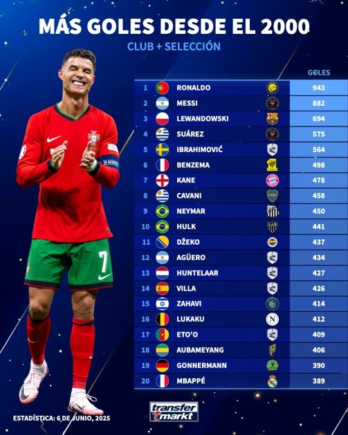 6月11日讯 德转迎来成立25周年,该数据网站也统计了自那时(2000年)以来进球最多(俱乐部+国家队)的球员,C罗、梅西、莱万前三。