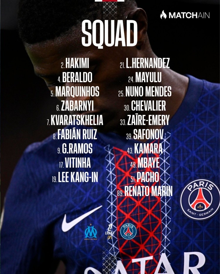 9月21日讯 北京时间明天凌晨2点45分,巴黎将在法甲第5轮比赛中客场对阵马赛,巴黎公布了此役的球员名单。登贝莱、杜埃、若奥-内维斯、巴尔科拉因伤缺席。