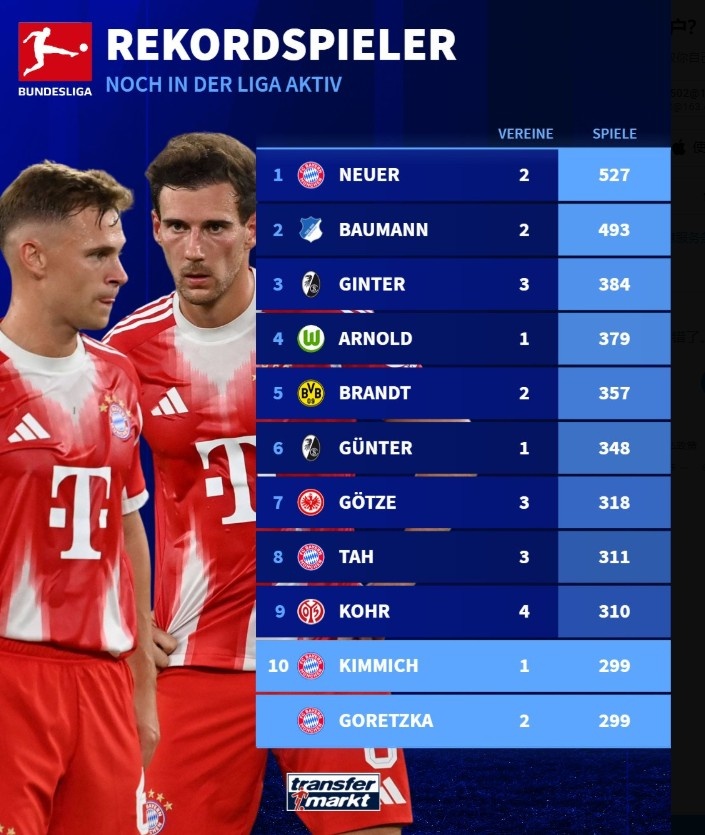 9月26日讯 德国转会市场盘点了德甲现役球员联赛出场数,诺伊尔以527场居首,基米希、格雷茨卡均299场闯进前10,即将迎来300场里程碑。