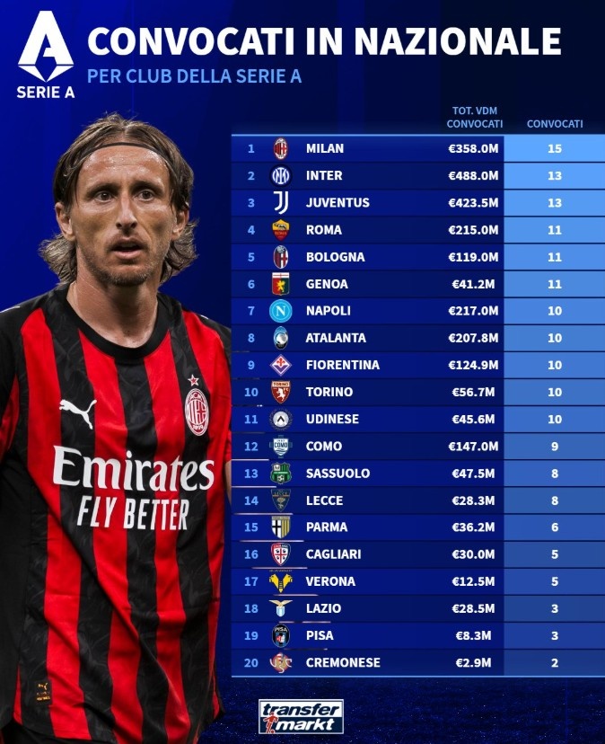 10月9日讯 随着10月国际比赛日的到来,意甲各队均有球员被国家队征召,其中米兰被征召15人最多,国米和尤文各被征召13人位居其后。
