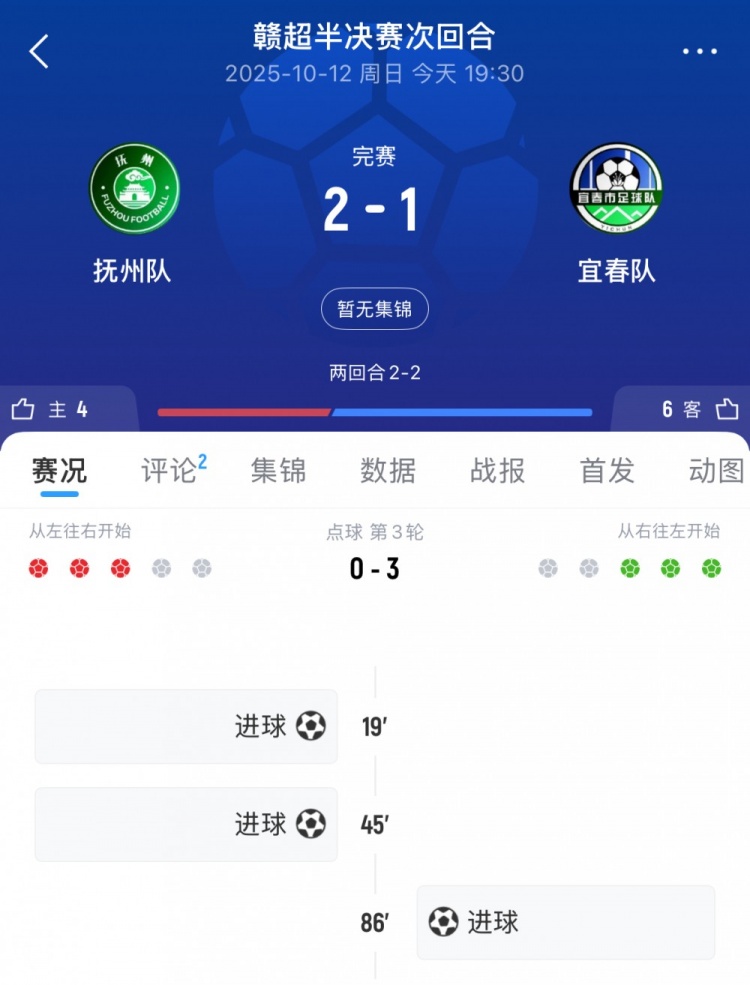 点球大战宜春队门将余琪轩超神发挥!抚州队前三罚全部罚丢,第一罚被余琪轩直接扑出,第二罚直接罚上看台,第三罚还是被余琪轩扑出;宜春队前三罚则全部稳稳命中,最终宜春队点球大战3-0淘汰抚州队,与赣州队会师决赛。